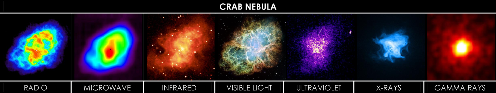 La nebulosa del cangrejo, un remanente de supernova, y el objeto mejor estudiado fuera del sistema solar debido a su relativa cercanía, nos ha permitido descubrir detalles asombrosos de la vida de las estrellas, su composición, su evolución. Aquí, en una última fotografía para hoy, la tenemos en siete vistas: la misma imagen, con distintos ojos.