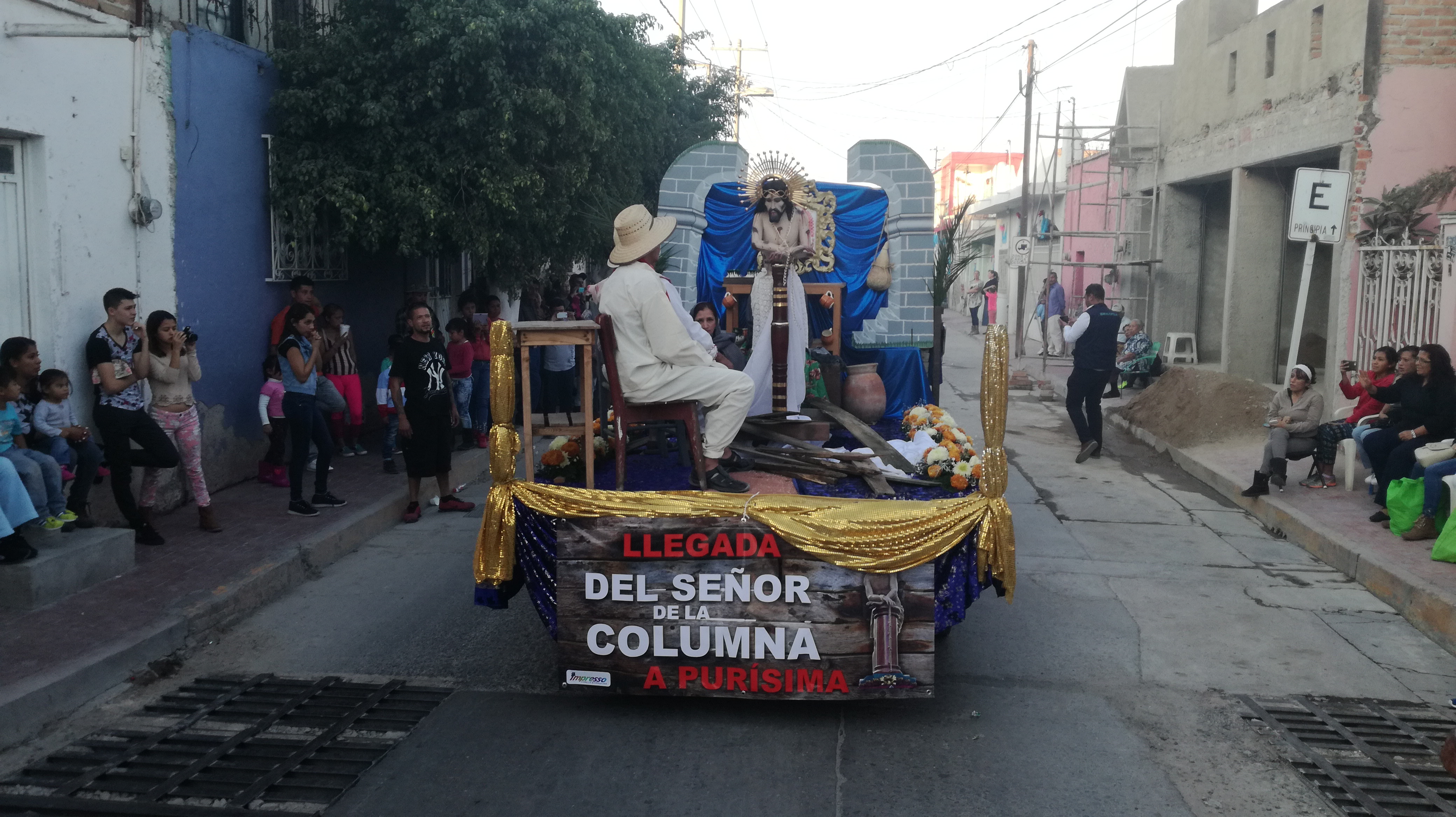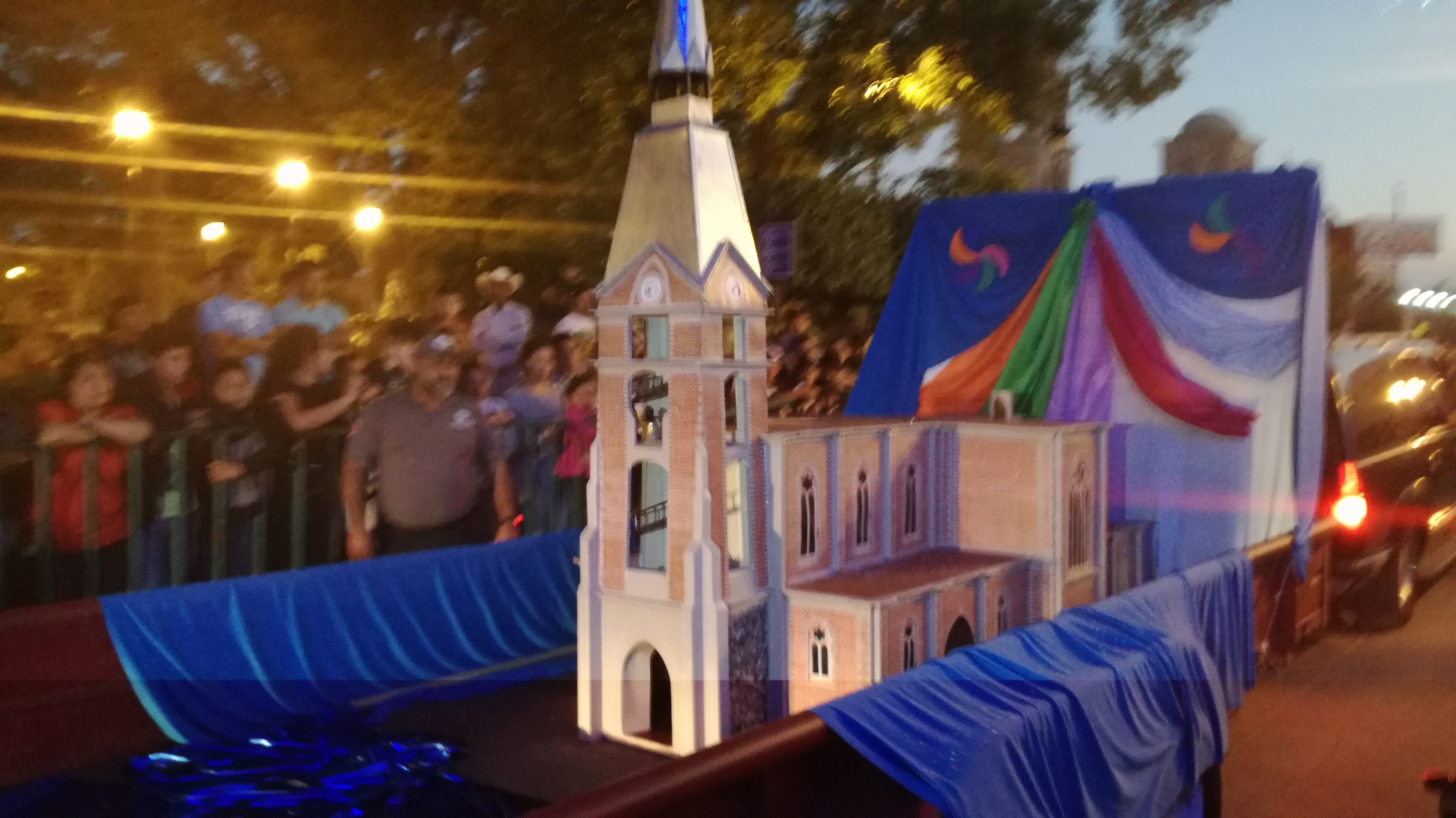 El Pueblo Mágico de Jalpa de Cánovas, arranco gritos de sorpresa y alegría, ya que detrás de la comitiva con su estandarte, avanzaba una camioneta con una reproducción a escala de su Parroquia.